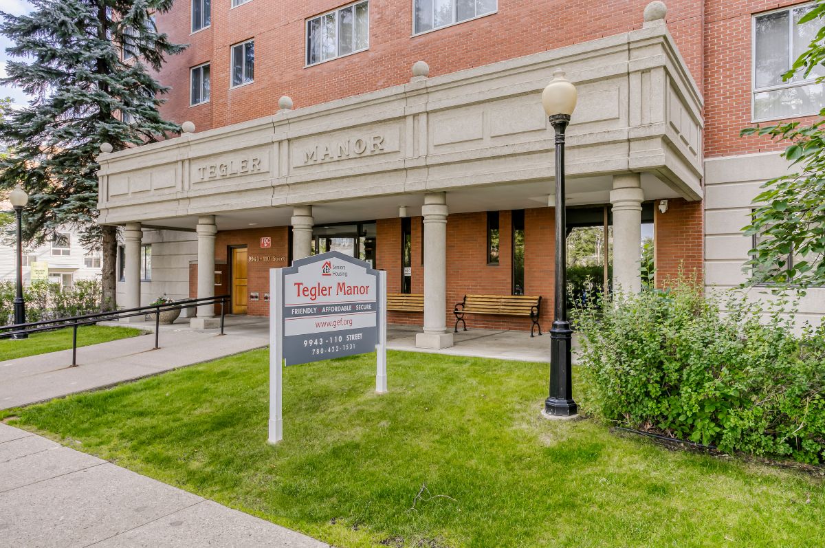 Tegler Manor is a 14-story residence with 101 units. The building amenities include multiple social rooms, where tenants can entertain or relax. As well, tenants can enjoy the green courtyard from the solarium or on the landscaped patio.